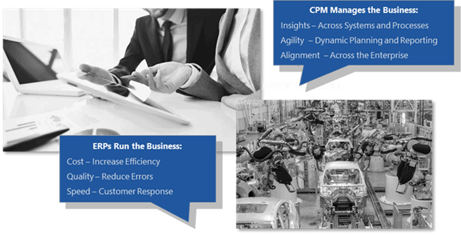 Řešení CPM nebo EPM (viz obrázek 1 níže) je management aplikační vrstvou nad všemi transakčními systémy. Software CPM poskytuje úroveň agility a relevantnosti pro exekutivní management, které jsou stále více kritické pro každou organizaci, která chce úspěšně zvládat složitosti růstu a změn. Nejmodernější CPM jsou tak flexibilní, že dokáží spolehlivě fungovat i přesto, když dochází k průběžnému upgradu či změně na dilčím ERP. A během přechodného období to lze provést bez narušení kritických procesů řízení, jako je plánování a výkaznictví.